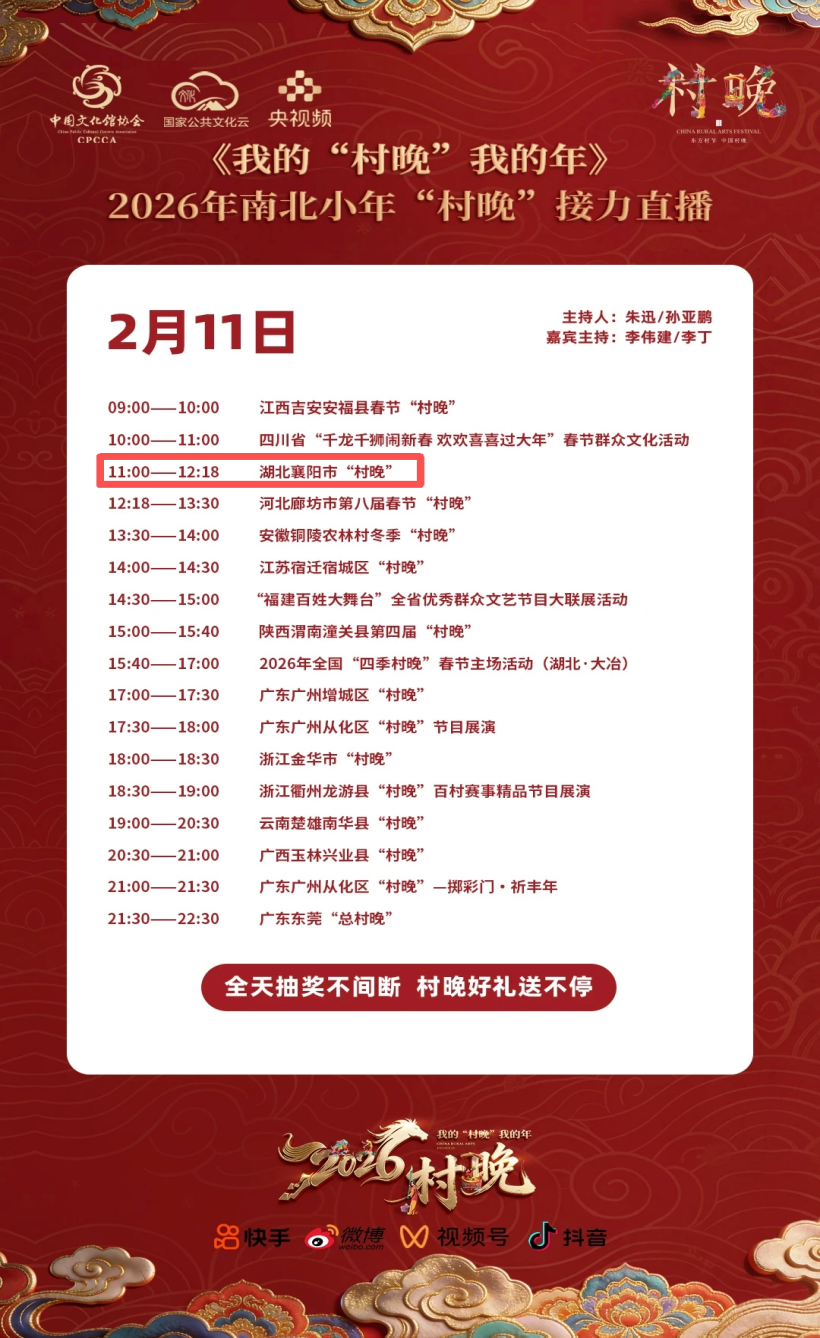 近日,国家公共文化云平台公布《我的“村晚”我的年》2026年全国南北小年接力直播名单,樊城区组织举办的一场特色“村晚”成功入选,将于2月11日(南方小年)上午11:00通过国家公共文化云、央视频等国家级平台面向全国观众直播。
